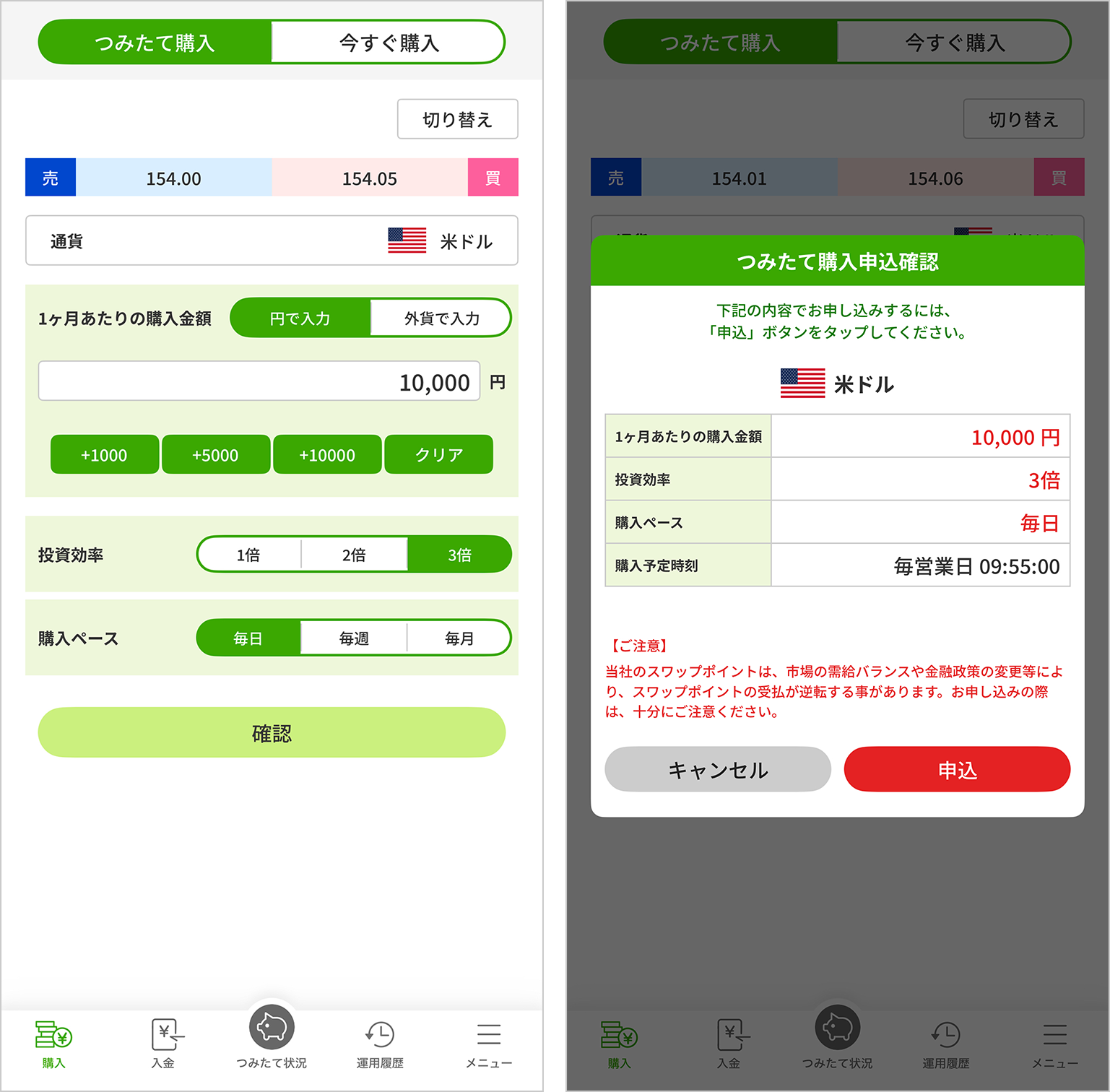 通貨、1ヶ月あたりの購入金額、投資効率(レバレッジ)、購入ペースを選んで申込するだけで、設定した内容に沿って自動で通貨を購入してくれるため、忙しい方でも無理なく資産運用を継続できます。