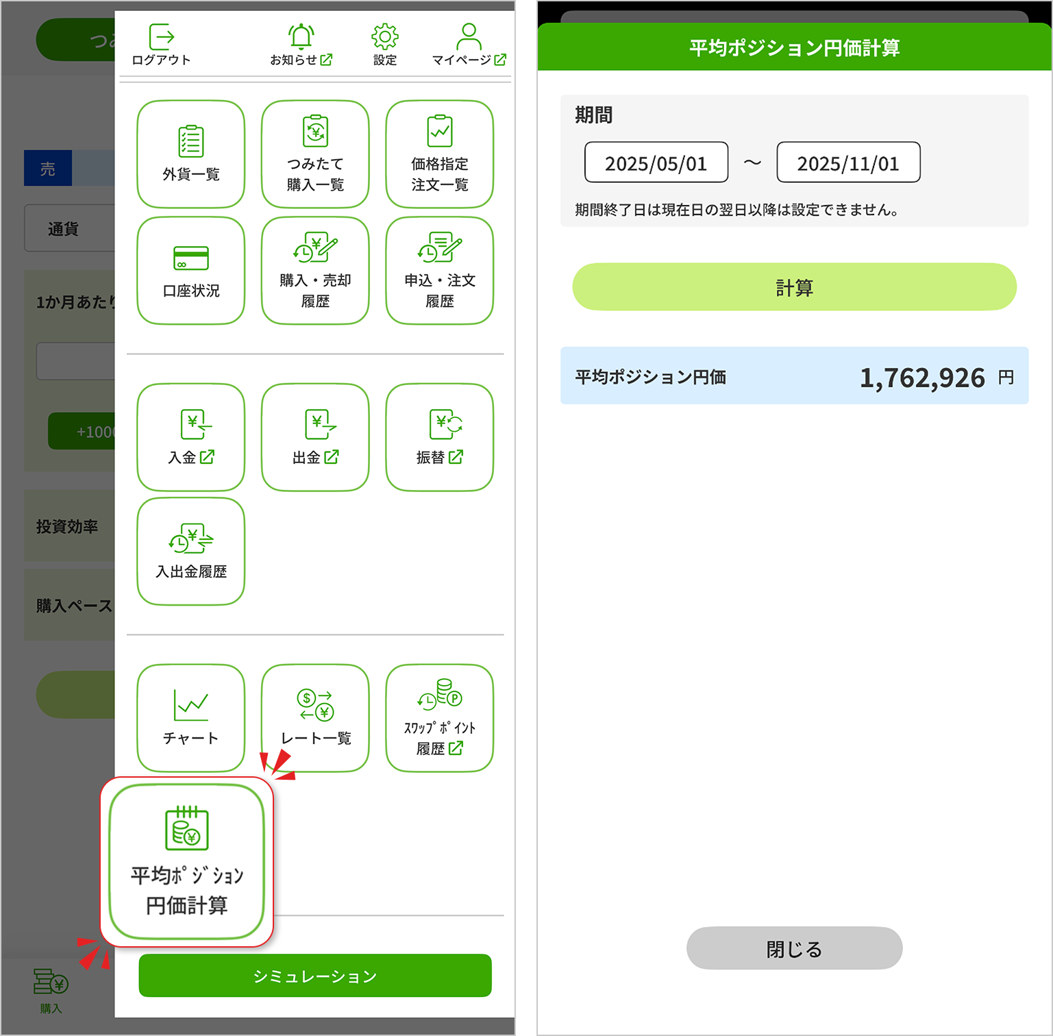 メニュー内の「平均ポジション円価計算」では、期間を入力するだけで、簡単に平均ポジション円価を確認できます。これにより、例えば宝くじの付与条件を満たしているかどうかも、手軽に確認することができます。