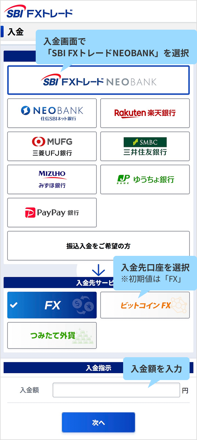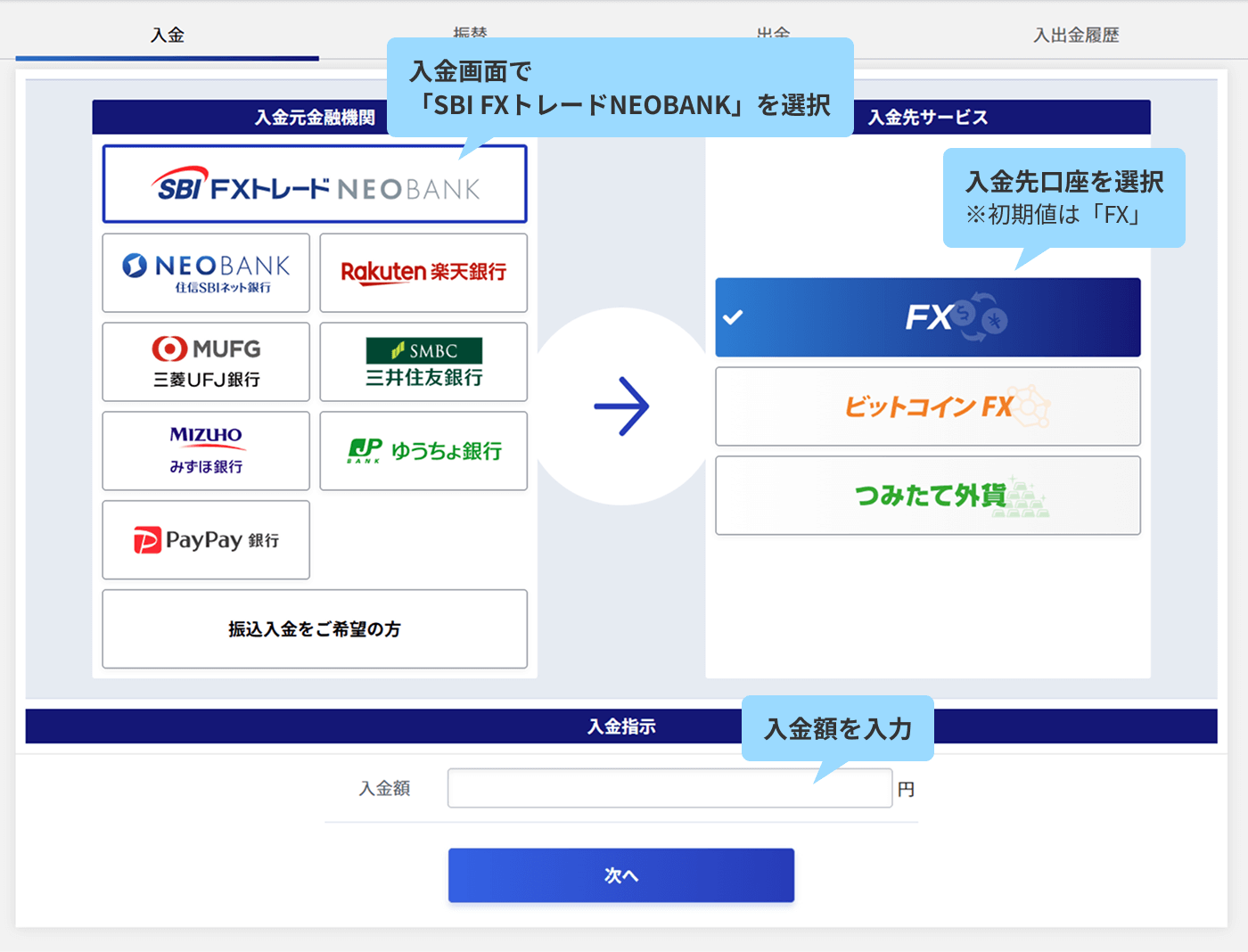 SBI FXトレードNEOBANK口座からの入金は、マイページもしくは各取引ツールの「入出金」→「入金」から「SBI FXトレードNEOBANK」を選択して入金額を入力してください。