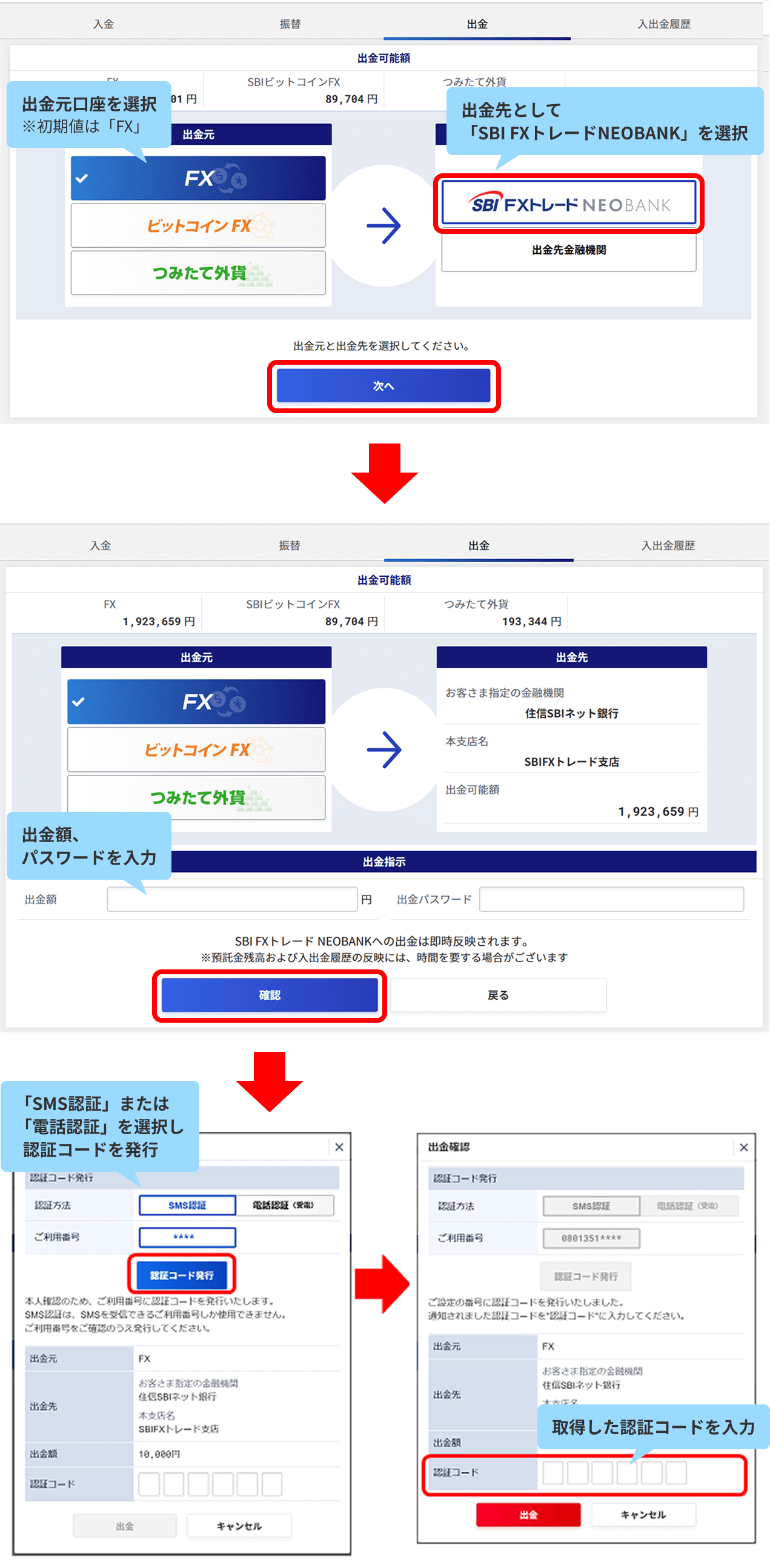 SBI FXトレードNEOBANK口座への出金のご依頼はマイページもしくは各取引ツールの「入出金」→「出金」より、「SBI FXトレードNEOBANK」をご選択ください。