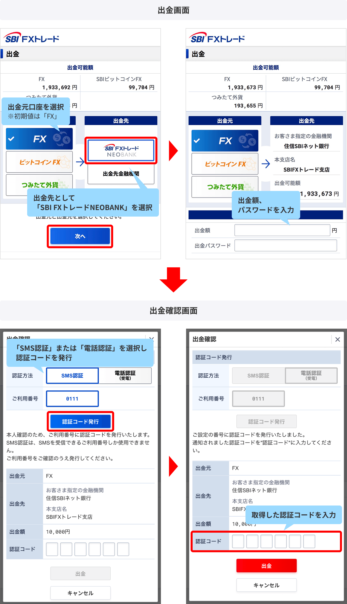 ショートメールの受信(SMS認証)もしくは自動音声案内 (電話認証)で取得した認証コードを入力し、「出金」ボタンを押してください。
