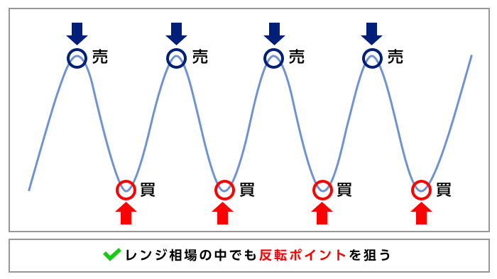 一方、トレンド相場ではなく、ある一定の値幅を行き来するような「レンジ相場」では、順張りだと十分な利益を狙うのが難しいといえます。
