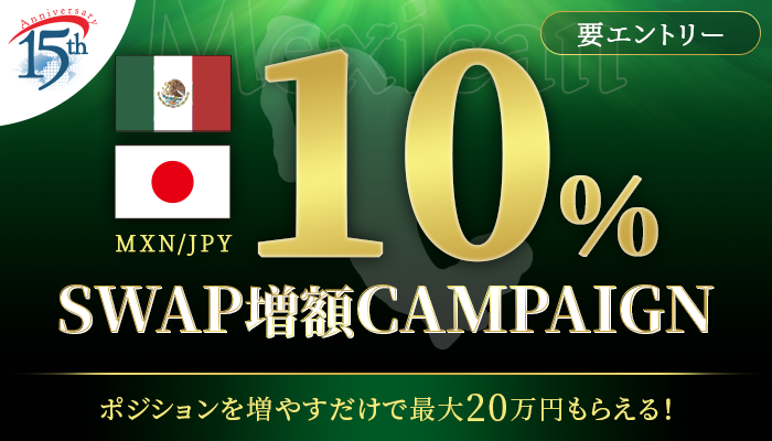 キャンペーン期間中、メキシコペソ/円(MXN/JPY)において新規建てしたポジションを対象に、受取りスワップポイントに10%上乗せしてキャッシュバックいたします。