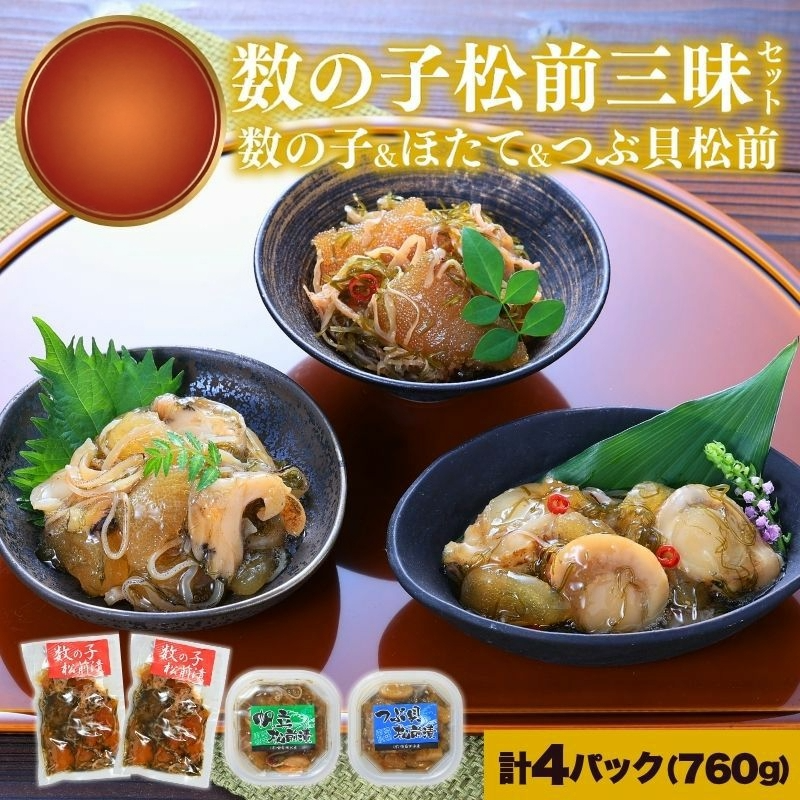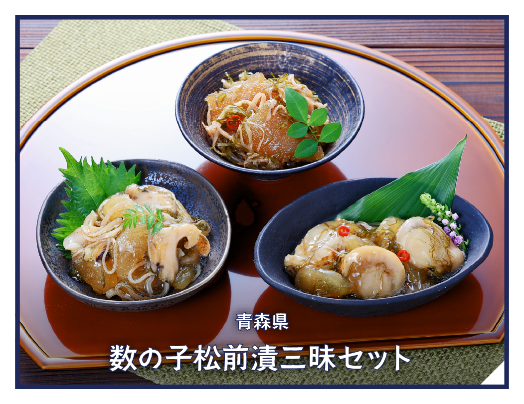 数の子・ほたて・つぶ貝の3種を各パックに分けてお届け。冷凍で長期保存もできるため、晩酌のお供やご褒美グルメとしてお楽しみください。
