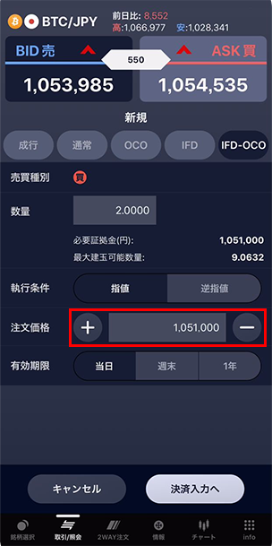 - 10. 決済時の指値価格と逆指値価格を入力し、「確認画面へ」ボタンをタップする