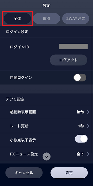 アプリ本体の設定を変更できます。ここからログイン/ログアウトもできます。また、アプリ起動時のメインページ指定、レート更新間隔、小数点以下の表示の設定、およびニュース配信元が選択できます。