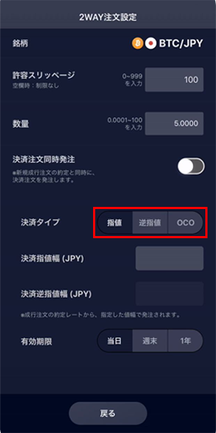 - 5. 「指値」、「逆指値」、「OCO」から使用したい決済種類を選択する