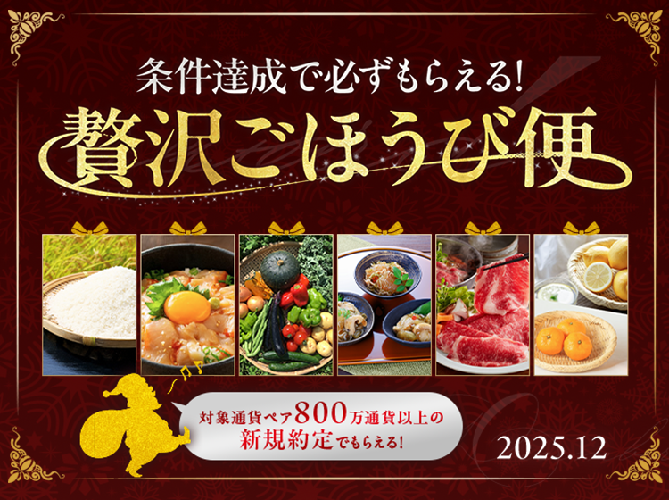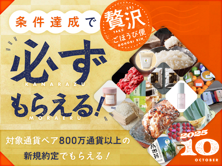 【対象通貨ペア800万通貨以上の新規約定】の条件達成で必ずもらえる!贅沢ごほうび便開催!日本各地の“こだわりの逸品”をプレゼント!