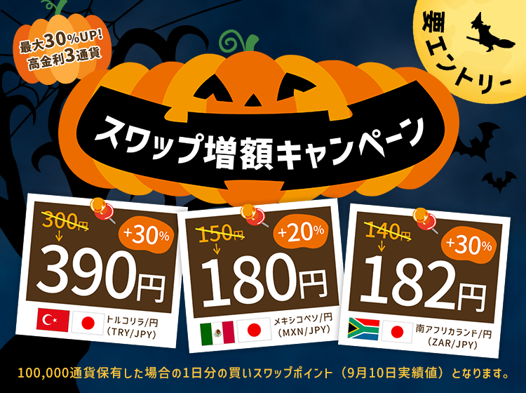 最大30%UP!高金利3通貨スワップ増額キャンペーン開催中!対象通貨ペアにおいて新規建てしたポジションを対象に受取りスワップポイントに上乗せしてキャッシュバックいたします!