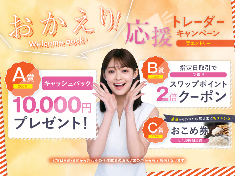 キャンペーン期間中、当社取扱いの34通貨ペアからロシアルーブル/円(RUB/JPY)を除いた33通貨ペア新規約定50万通貨以上のお取引をいただいたお客さまの中から、抽選で総勢500名様に賞品をプレゼントいたします!
