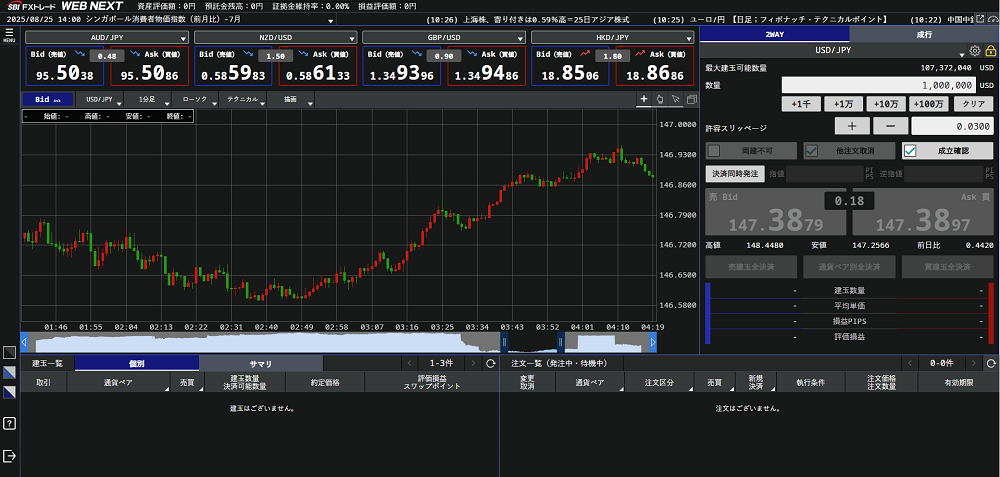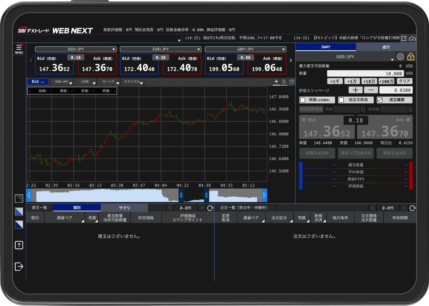 画面上部には新たに4通貨ペアを追加し、複数の通貨の動きを一目で確認できるようにしました。チャート表示も改善し、ピンチイン・ピンチアウトによる拡大・縮小操作に対応したことで、スマートフォンやタブレットでも直感的な操作が可能です。