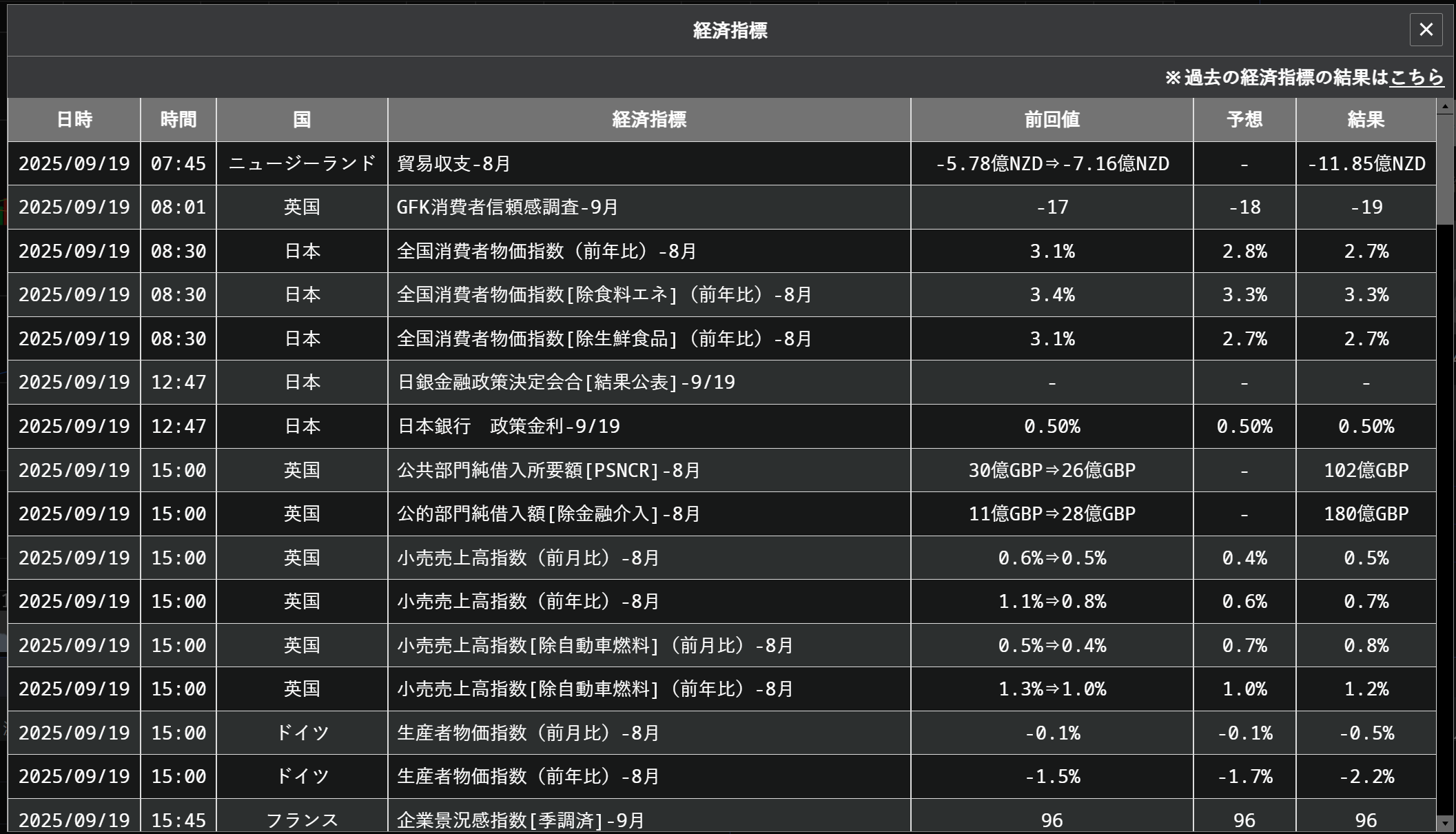 画面左上の経済指標をクリックすると、モーダルウィンドウが開き、前回値、予想値、結果がまとめて確認できるようになりました。
