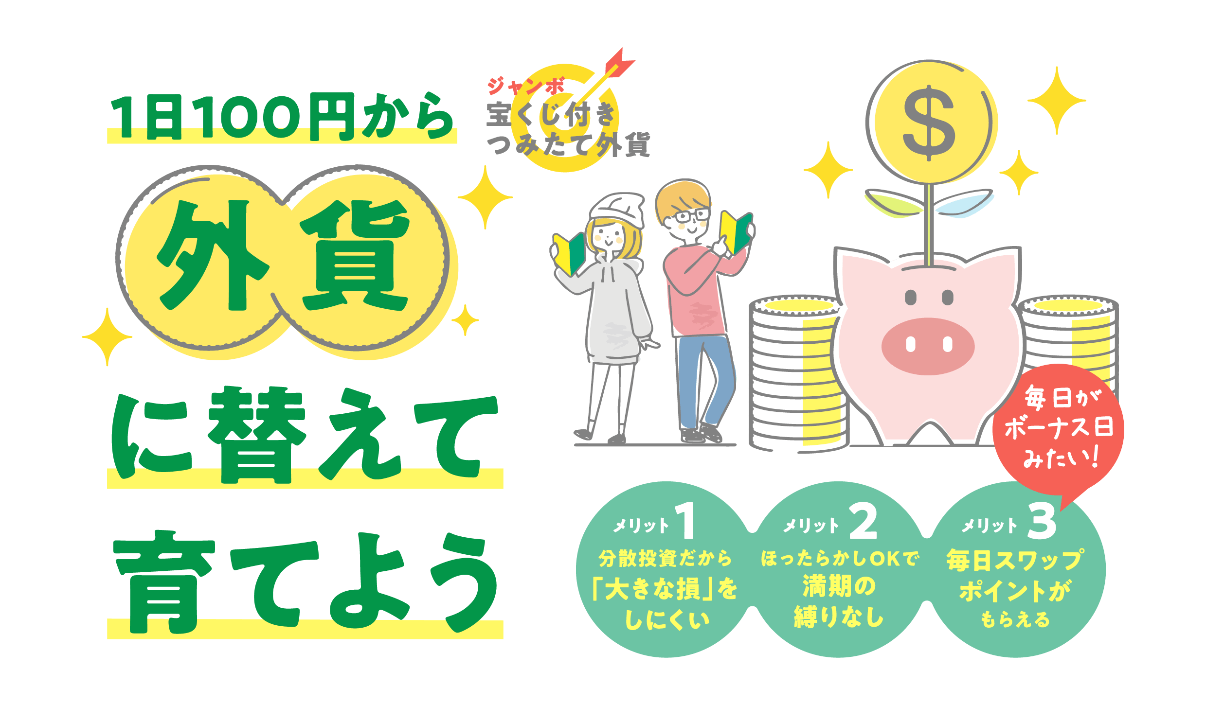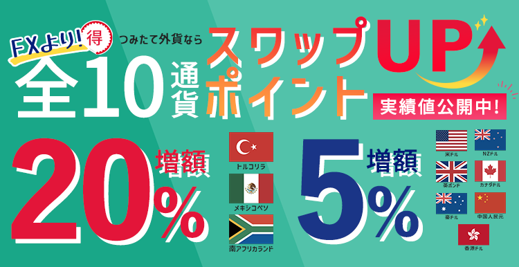 このたび、お客さまにより安定的かつ収益性の高い資産形成の機会をご提供するため、「つみたて外貨」におけるスワップポイントを一律5%増額、一部の人気通貨についてはさらに15%追加し、最大で20%増額して提供を開始いたしました。